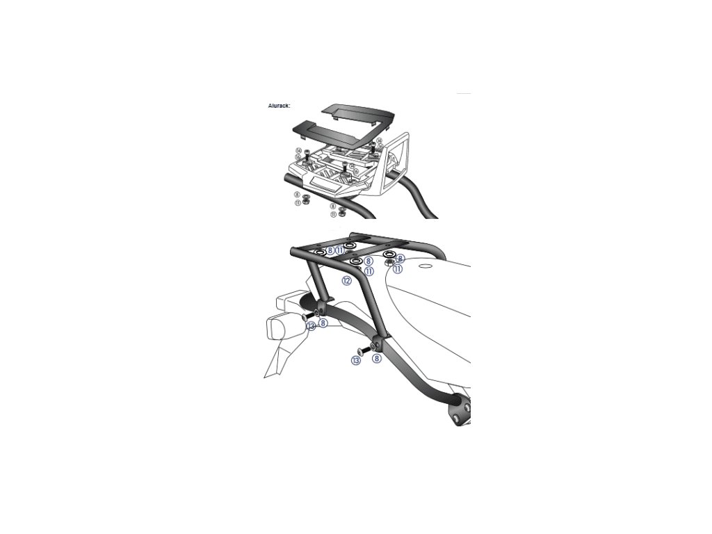 Držák TopCasae Alurack je setava sady spojovacího materiálu, dle typu motocyklu a hliníkového plata Hepco&Becker, s vyjímatelným madlem. Zamykatelně pasují na to všechny Hepco&Becker TopCase, které nemají v sériové výbavě plastový adaptér.
