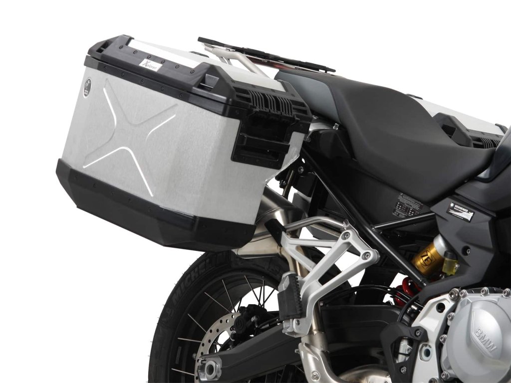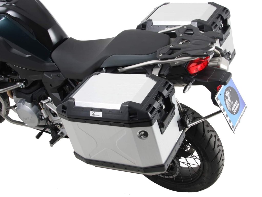 Nerezová sada nosičů kufrů s výřezem, včetně stříbrných kufrů s výřezem Xplorer CutOut, pro BMW F 850 GS Adventure (2019-2023)
