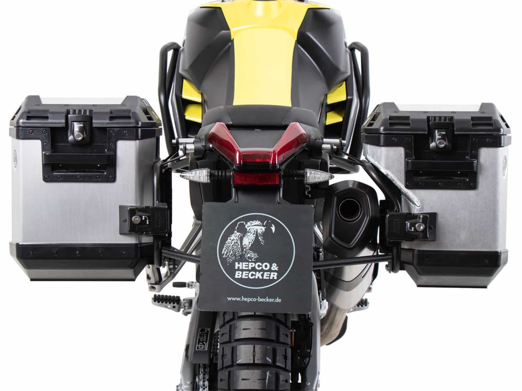 Set bestehend aus einem beidseitigem, Motorrad modellspezifischem Kofferträger in Kombination mit einem Xplorer 40 und einem ausgesparten Xplorer 37 Seitenkoffer inkl. Schlüssel, Schließzylinder und den benötigten Schlossadaptern, um die Koffer am Träger zu befestigen