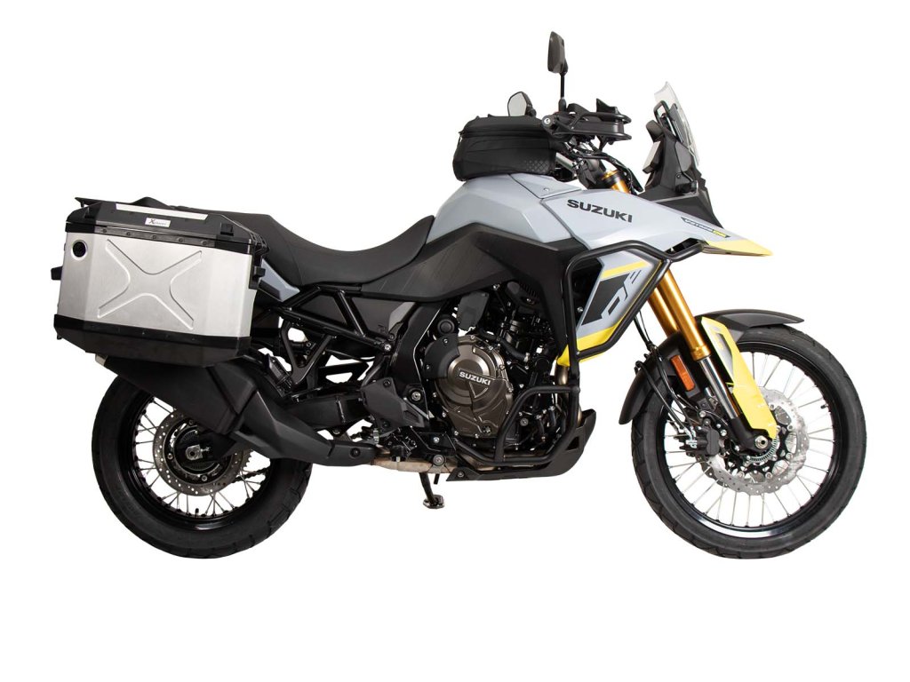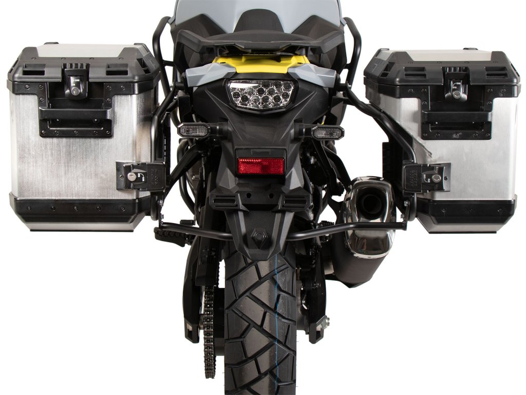 Černá sada nosičů kufrů s výřezem, včetně stříbrných kufrů s výřezem Xplorer CutOut, pro Suzuki V-Strom 800 DE (2023-)