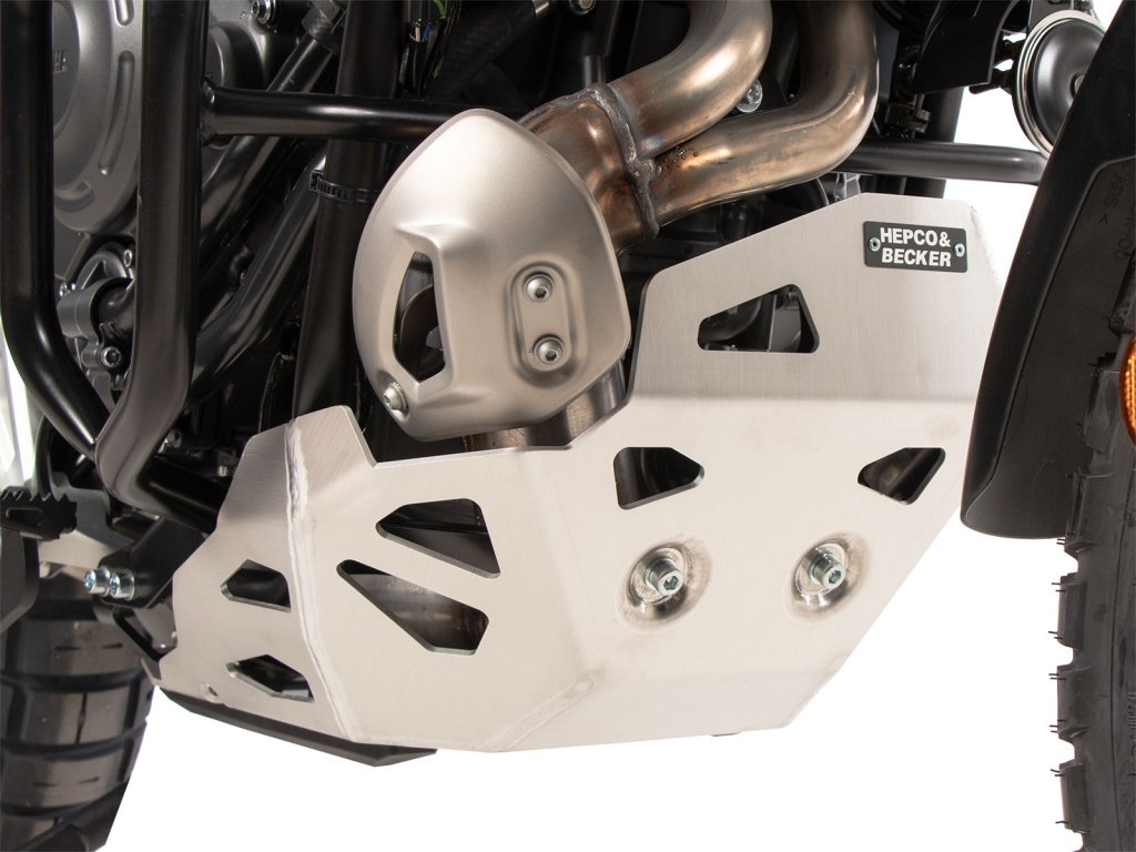 Samozřejmě, modelově specificky tvořeny, ze 4mm. silného duralového, vysoce pevného plechu. Při návrhu tvaru, Hepco&Becker dbal na to, aby bylo i nadále zajištěné dostatečné proudění vzduchu, dešťové, či potoční vody jak, kvůly chlazení, tak i pro udržení čistoty a vzhlerdu okolo motoru.