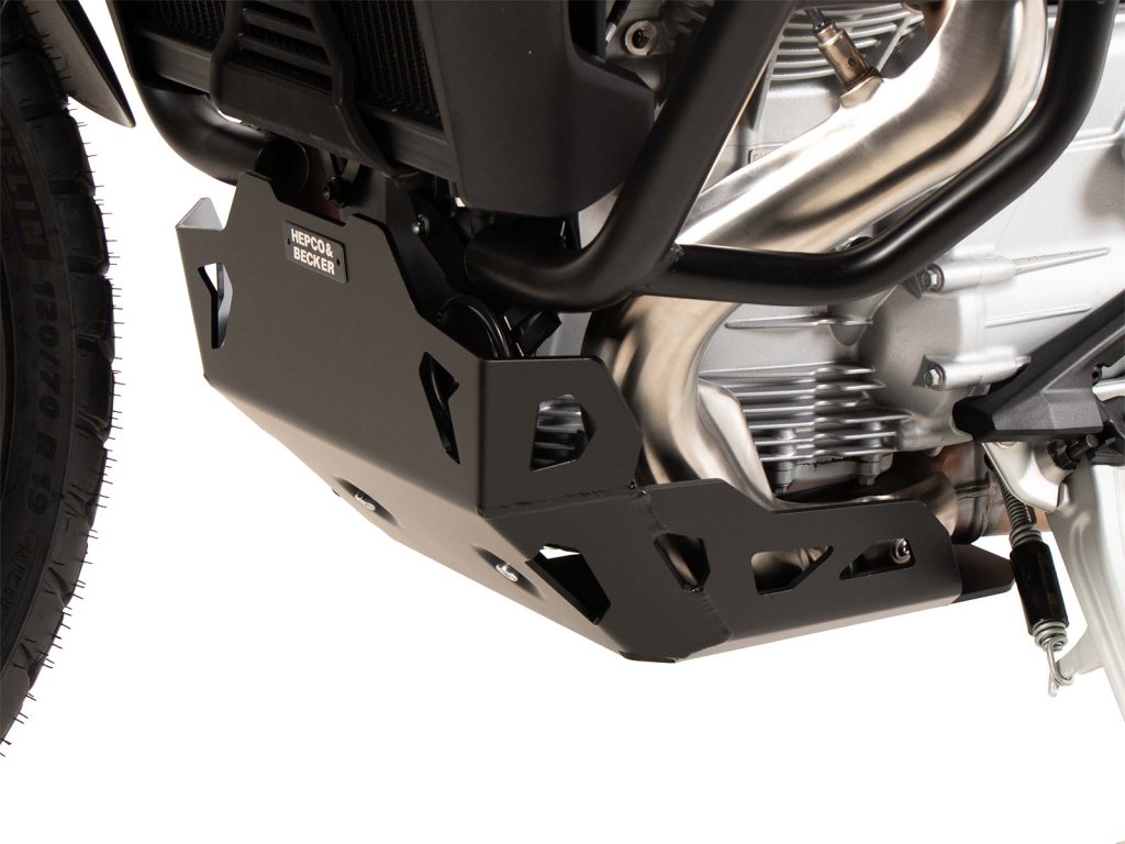 Samozřejmě, modelově specificky tvořeny, ze 4mm. silného duralového, vysoce pevného plechu. Při návrhu tvaru, Hepco&Becker dbal na to, aby bylo i nadále zajištěné dostatečné proudění vzduchu, dešťové, či potoční vody jak, kvůly chlazení, tak i pro udržení čistoty a vzhlerdu okolo motoru.