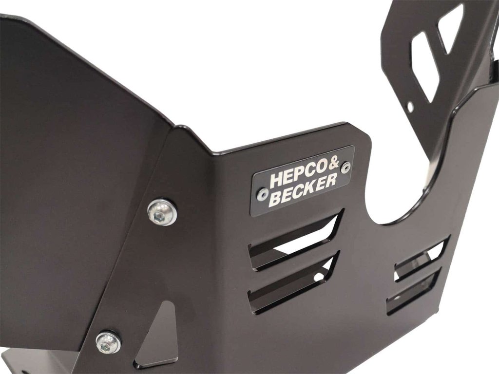 Samozřejmě, modelově specificky tvořeny, ze 4mm. silného duralového, vysoce pevného plechu. Při návrhu tvaru, Hepco&Becker dbal na to, aby bylo i nadále zajištěné dostatečné proudění vzduchu, dešťové, či potoční vody jak, kvůly chlazení, tak i pro udržení čistoty a vzhlerdu okolo motoru.