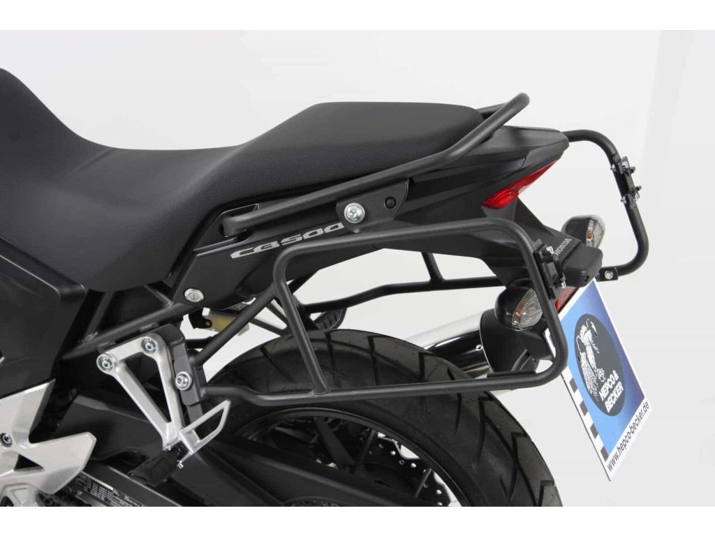 Napevno našroubované nenápadné držáky na rámu, na které pak rychloupínacími bajonetovými čepy během chvilky připevníte, či sundáte rámy pro boční kufry, od Hepco&Becker , jsou pevně spojeny s motocyklem. Na tito držáky pak jsou použitelné, prakticky všechny boční kufry Hepco&Becker, od 30l. a výše. Kufry jsou pak pevnými kovovými zámky přizamknuty k těmto drážkům. Víka kufrů jsou také zamykatelné a tak jsou zajištěny i proti krádeži. Protikusy zámků, které se šroubují na tito držáky a do kterých se "zakusují" zámky, jsou pak součástí dodávky kufrů.