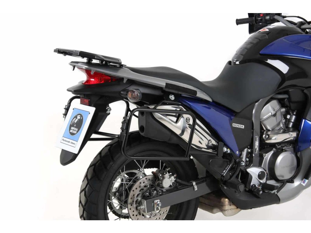 Napevno našroubované nenápadné držáky na rámu, na které pak rychloupínacími bajonetovými čepy během chvilky připevníte, či sundáte rámy pro boční kufry, od Hepco&Becker , jsou pevně spojeny s motocyklem. Na tito držáky pak jsou použitelné, prakticky všechny boční kufry Hepco&Becker, od 30l. a výše. Kufry jsou pak pevnými kovovými zámky přizamknuty k těmto drážkům. Víka kufrů jsou také zamykatelné a tak jsou zajištěny i proti krádeži. Protikusy zámků, které se šroubují na tito držáky a do kterých se "zakusují" zámky, jsou pak součástí dodávky kufrů.