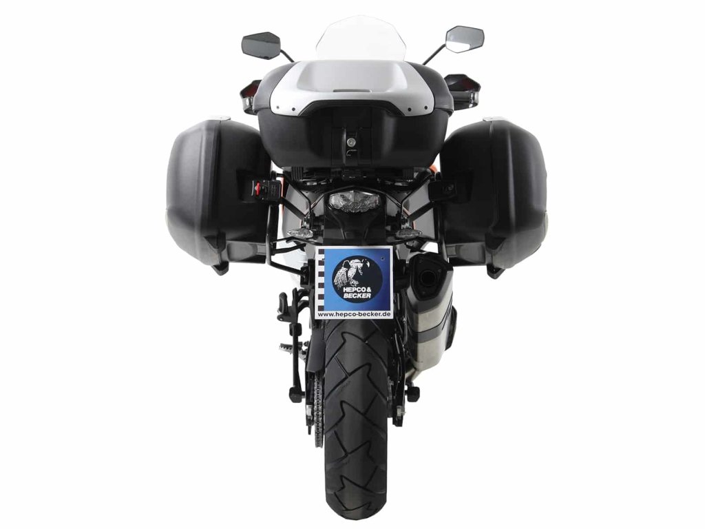 Napevno našroubované nenápadné držáky na rámu, na které pak rychloupínacími bajonetovými čepy během chvilky připevníte, či sundáte rámy pro boční kufry, od Hepco&Becker , jsou pevně spojeny s motocyklem. Na tito držáky pak jsou použitelné, prakticky všechny boční kufry Hepco&Becker, od 30l. a výše. Kufry jsou pak pevnými kovovými zámky přizamknuty k těmto drážkům. Víka kufrů jsou také zamykatelné a tak jsou zajištěny i proti krádeži. Protikusy zámků, které se šroubují na tito držáky a do kterých se "zakusují" zámky, jsou pak součástí dodávky kufrů.