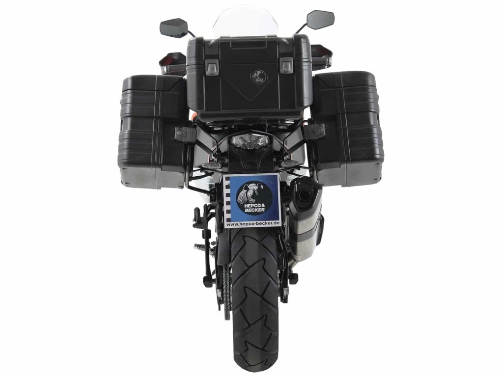 Napevno našroubované nenápadné držáky na rámu, na které pak rychloupínacími bajonetovými čepy během chvilky připevníte, či sundáte rámy pro boční kufry, od Hepco&Becker , jsou pevně spojeny s motocyklem. Na tito držáky pak jsou použitelné, prakticky všechny boční kufry Hepco&Becker, od 30l. a výše. Kufry jsou pak pevnými kovovými zámky přizamknuty k těmto drážkům. Víka kufrů jsou také zamykatelné a tak jsou zajištěny i proti krádeži. Protikusy zámků, které se šroubují na tito držáky a do kterých se "zakusují" zámky, jsou pak součástí dodávky kufrů.