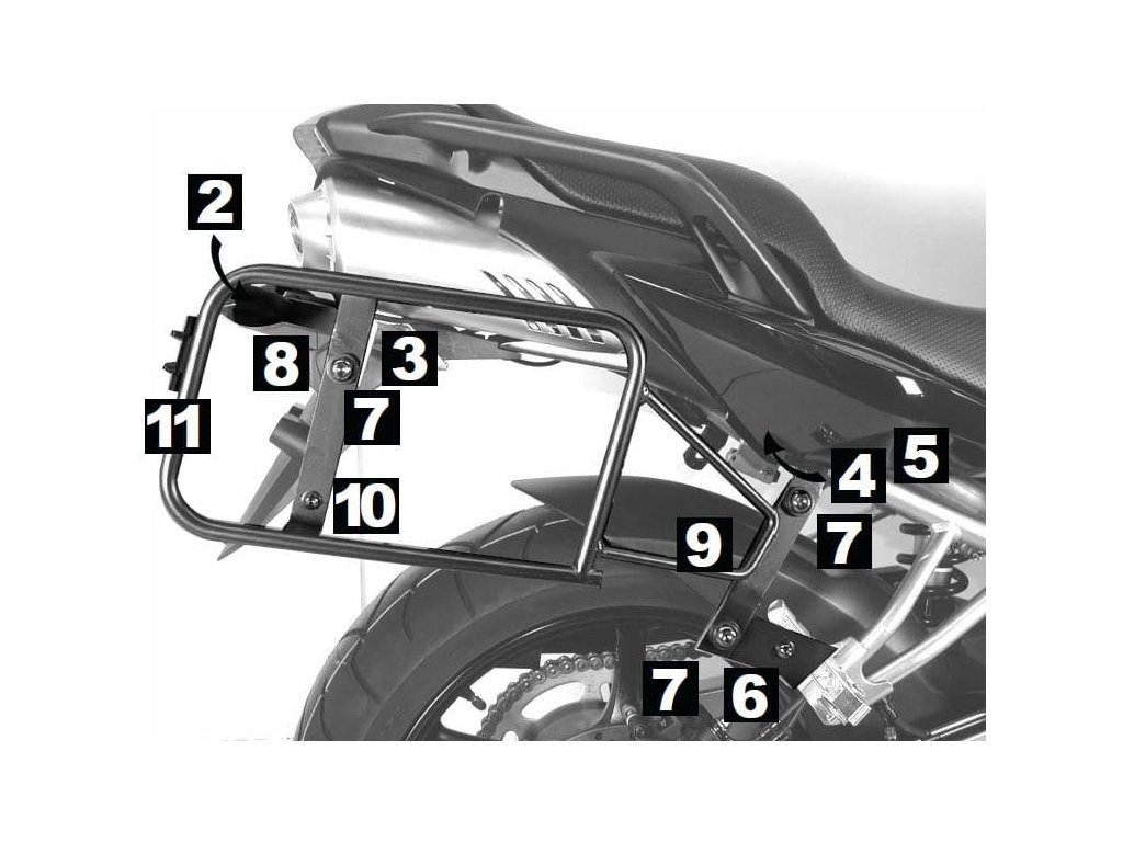 Napevno našroubované nenápadné držáky na rámu, na které pak rychloupínacími bajonetovými čepy během chvilky připevníte, či sundáte rámy pro boční kufry, od Hepco&Becker , jsou pevně spojeny s motocyklem. Na tito držáky pak jsou použitelné, prakticky všechny boční kufry Hepco&Becker, od 30l. a výše. Kufry jsou pak pevnými kovovými zámky přizamknuty k těmto drážkům. Víka kufrů jsou také zamykatelné a tak jsou zajištěny i proti krádeži. Protikusy zámků, které se šroubují na tito držáky a do kterých se "zakusují" zámky, jsou pak součástí dodávky kufrů.
