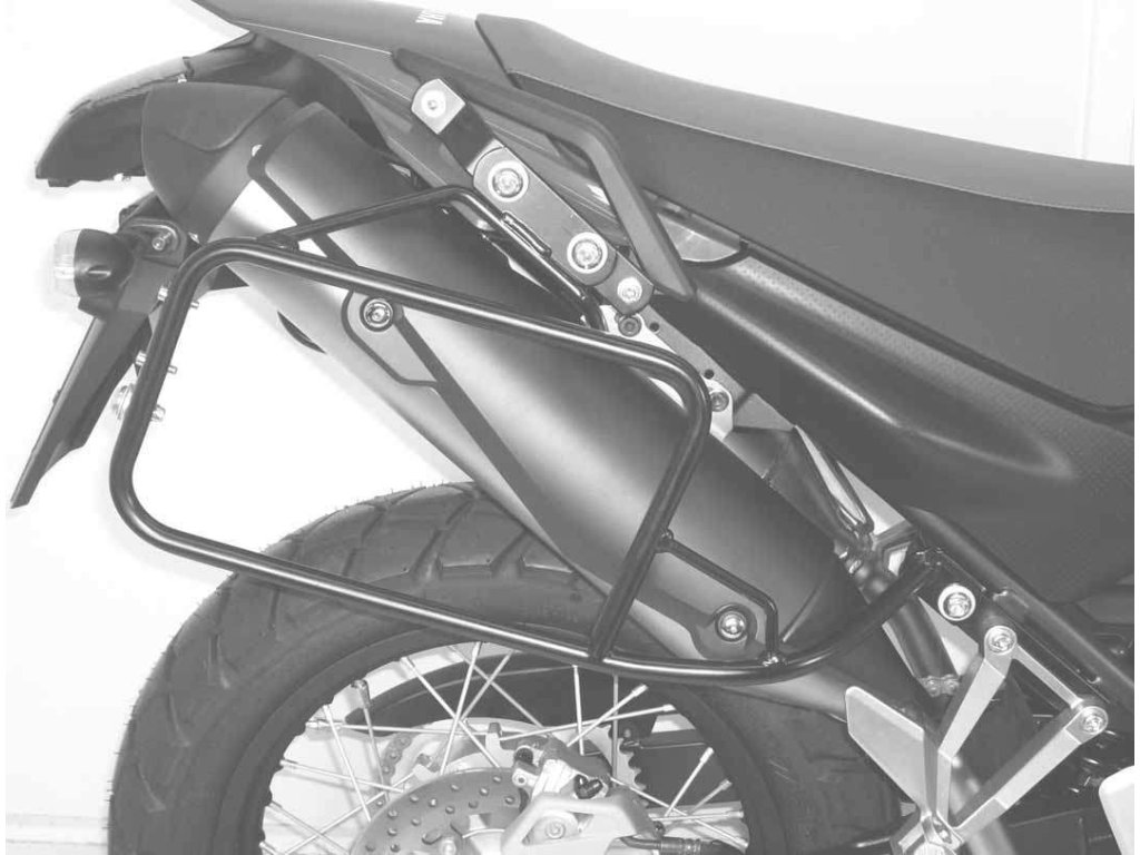 Napevno našroubované nenápadné držáky na rámu, na které pak rychloupínacími bajonetovými čepy během chvilky připevníte, či sundáte rámy pro boční kufry, od Hepco&Becker , jsou pevně spojeny s motocyklem. Na tito držáky pak jsou použitelné, prakticky všechny boční kufry Hepco&Becker, od 30l. a výše. Kufry jsou pak pevnými kovovými zámky přizamknuty k těmto drážkům. Víka kufrů jsou také zamykatelné a tak jsou zajištěny i proti krádeži. Protikusy zámků, které se šroubují na tito držáky a do kterých se "zakusují" zámky, jsou pak součástí dodávky kufrů.