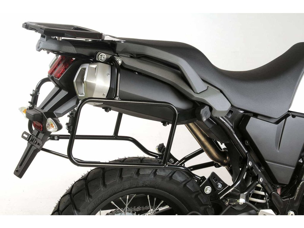 Napevno našroubované nenápadné držáky na rámu, na které pak rychloupínacími bajonetovými čepy během chvilky připevníte, či sundáte rámy pro boční kufry, od Hepco&Becker , jsou pevně spojeny s motocyklem. Na tito držáky pak jsou použitelné, prakticky všechny boční kufry Hepco&Becker, od 30l. a výše. Kufry jsou pak pevnými kovovými zámky přizamknuty k těmto drážkům. Víka kufrů jsou také zamykatelné a tak jsou zajištěny i proti krádeži. Protikusy zámků, které se šroubují na tito držáky a do kterých se "zakusují" zámky, jsou pak součástí dodávky kufrů.