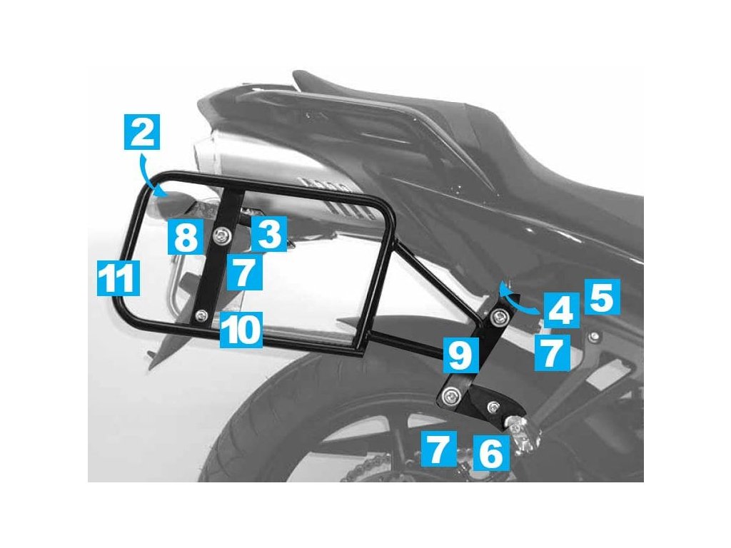 Napevno našroubované nenápadné držáky na rámu, na které pak rychloupínacími bajonetovými čepy během chvilky připevníte, či sundáte rámy pro boční kufry, od Hepco&Becker , jsou pevně spojeny s motocyklem. Na tito držáky pak jsou použitelné, prakticky všechny boční kufry Hepco&Becker, od 30l. a výše. Kufry jsou pak pevnými kovovými zámky přizamknuty k těmto drážkům. Víka kufrů jsou také zamykatelné a tak jsou zajištěny i proti krádeži. Protikusy zámků, které se šroubují na tito držáky a do kterých se "zakusují" zámky, jsou pak součástí dodávky kufrů.