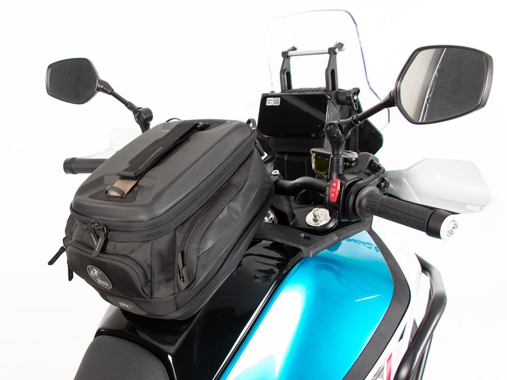 - Odemknutí: Mechanismus se odemkne pomocí pásku v přední části tankové brašny ve směru jízdy; tanková-nádržová brašna se jednoduše sejme.