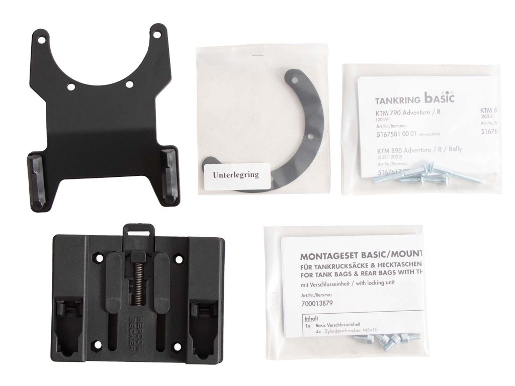 Součástí dodávky je tankový kroužek BASIC a protikus, který lze individuálně přišroubovat k tankvaku v závislosti na tvaru nádrže a úhlu řídítek.