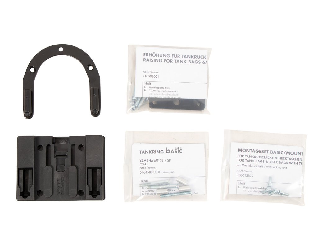 Součástí dodávky je tankový kroužek BASIC a protikus, který lze individuálně přišroubovat k tankvaku v závislosti na tvaru nádrže a úhlu řídítek.