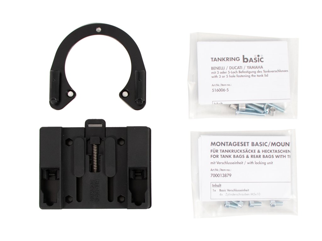 Součástí dodávky je tankový kroužek BASIC a protikus, který lze individuálně přišroubovat k tankvaku v závislosti na tvaru nádrže a úhlu řídítek.